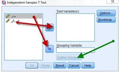 در کادر باز شده دو جای خالی وجود دارد. در جای خالی اول (test variable) متغیر یا متغیرهایی که میخواهید در دو گروه مقایسه شود را وارد نمایید (برای مثال نمره افسردگی یا سن). در کادر دوم نیز گروههای مورد مقایسه را وارد کنید مانند گروه مادران شهری و روستایی یا برند دو ماشین. سپس روی گزینه Define Group (فلش سبز) کلیک کنید.