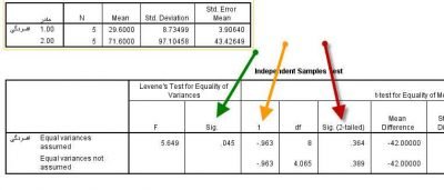 پس از زدن گزینه Ok نتایج خروجی شما ظاهر میگردد.در این جدول شما باید مقدار t (فلش زرد) و مقدار معنی داری (فلش قرمز) را گزارش کنید. اما همانطور که در شکل زیر میبینید دو سطر وجود دارد و برای t دو عدد گزارش شده است. اگر فلش سبز (یعنی معنی داری آزمون لوین) معنی دار باشد باید سطر دوم را گزارش کنید و اگر معنی دار نباشد سطر اول را گزارش کنید.