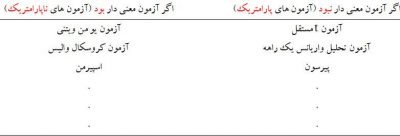 | مقایسه سه گروه یا بیشتر (وابسته) | آزمون آنالیز واریانس با اندازه های مکرر | آزمون فریدمن | آزمون کوکران |