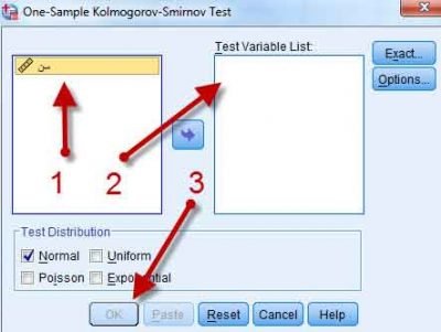 نرم افزار spss را باز کرده و به مسیر زیر بروید: Analyze> Nonparametric Test> Legacy Dialogs> 1Sample K-S. پس از رفتن به مسیر بالا به صفحه زیر هدایت خواهید شد. در این صفحه متغیری که میخواهید مورد آزمون قرار گیرد را انتخاب و در کادر Test Variable List وارد کنید. سپس Ok را بزنید.
