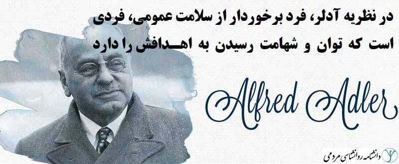 در نظریه آدلر، فرد برخوردار از سلامت عمومی، فردی است که توان و شهامت رسیدن به اهـدافش را دارد. چنـین فردی جذاب، شاداب، مطمئن و خوشبین است و ضمن پذیرفتن اشکالات خود، در حد توان اقدام به رفع آنها مـی کند. او روابط خانوادگی صمیمی و مطلوبی دارد و جایگـاه خـود را در جامعـه و خـانواده بـه درسـتی مـی شناسـد. در زندگی هدفمند و غایت مدار است و به دنبال غلبه بر یاس و دلسردی خود می باشد و در نهایـت موفـق مـی شـود کـه اهداف غیر سـازنده خـود را دگرگـون سـازد. علاقـه اجتمـاعی و مشـارکت از جملـه معیارهـای سـلامت روان اسـت(دریکورس، ۲۰۰۶).