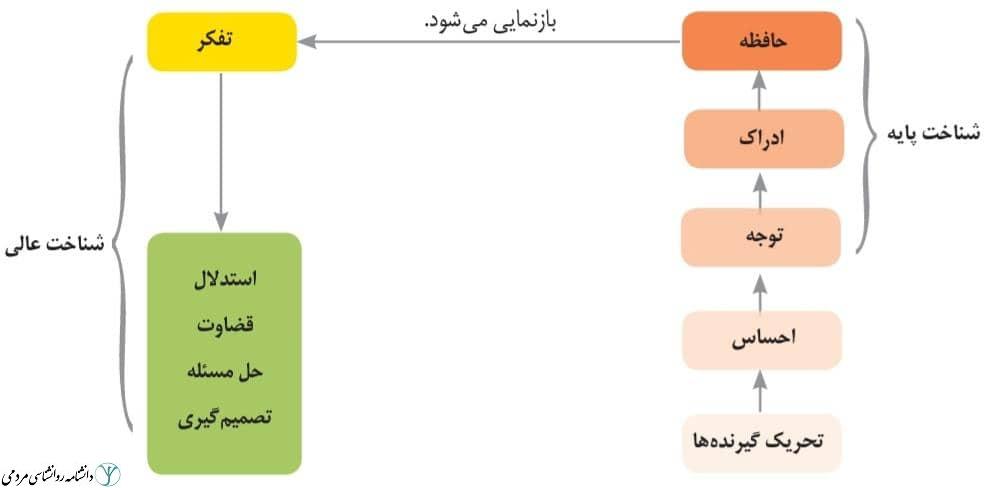 به فرایندهایی همچون احساس، توجه، ادراک و حافظه، «شناخت پایه» و به انواع تفکر و حل مسئله و قضاوت و تصمیم گیری، «شناخت عالی» میگویند.